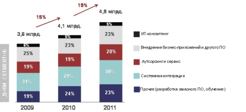 По оценкам «Астерос», в 2011 г. объем рынка ИТ-услуг достигнет 4,9 млрд долл., а его темпы развития не превысят 19% (см. диаграмму). Лидерами роста станут сегменты ИТ-аутсорсинга системной интеграции и внедрения бизнес-приложений и другого ПО. Основной движущей силой ИТ-аутсорсинга будет рост доли услуг по модели SaaS, в целом же это направление увеличится на 24%. Сегмент системной интеграции вырастет на 22%, а внедрения бизнес-приложений и другого ПО — на 19% благодаря реализации отложенного в