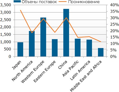 Одна из наиболее характерных особенностей рынка Smart TV в том, что ни один регион мира не остался «равнодушным» к этим устройствам. Стабильный спрос на ТВ-устройства с поддержкой доступа в Интернет существует не только в развитых странах, но и на развивающихся рынках и в регионах с низким уровнем проникновения широкополосного доступа (таких, как Ближний Восток и Африка).