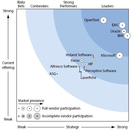 По мнению Forrester, группа ключевых игроков рынка — IBM, EMC, OpenText и Oracle — продолжают доминировать на ECM-рынке, но все же они теперь в большей степени фокусируются не на решении всего спектра задач, а на определенный круг проблем заказчиков (например, управление контрактами, обработка счетов и накладных). Особняком тут по-прежнему компания Microsoft со своей давней стратегией «ECM для масс», реализуемой на базе SharePoint. ИТ-директора уже смирились с тем, что они просто не получат от руководства бюджета на дополнительные ECM-технологии, если задачи можно решить с помощью SharePoint. Соответственно другие вендоры в своих продуктах стараются развивать именно те функции, которых нет у Microsoft.