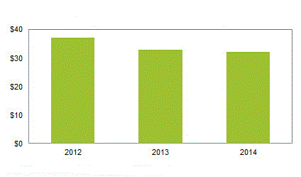 В 2013 г. продажи HDD, как прогнозирует компании IHS iSuppi, предположительно сократятся на 11.8% и составят 32.7 млрд долл., тогда как в 2012 г. объем продаж был 37.1 млрд долл. Примерно на том же уровне (32.0 млрд долл.) объем продаж HDD сохранится и в 2014 г. (см. диаграмму).