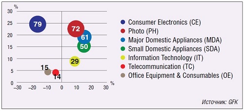 Основная причина такой динамики в том, что, в связи с известными мировыми экономическими проблемами доходы населения не растут, и в такие моменты ИТ не являются приоритетными технологиями в покупательском спросе. Приведенная диаграмма отчетливо демонстрирует падение приоритета товаров группы ИТ, показавших наихудшую динамику продаж в первом полугодии 2013 г. среди всех смежных товаров электробытового профиля. Снижение в годовом исчислении составило почти 20%. В принципе это понятно, в условиях ограниченного бюджета траты населения могут возрасти только на продукты, существенно меняющие качество жизни. Например, в свое время был всплеск трат на мобильные телефоны, потому что обладание ими действительно меняло качество жизни. В 2011 и 2012 гг. был всплеск покупок ПК, что, с одной стороны, объясняется произошедшим в это время значительным падением цен на них, и это позволило людям купить второй и даже третий компьютер в дом. Но в определенной мере повышенный спрос здесь тоже обосновывался неким изменением качества жизни, поскольку компьютер общего пользования в доме это одно, а индивидуальные (в идеале) ПК для каждого члена семьи – совсем другое.