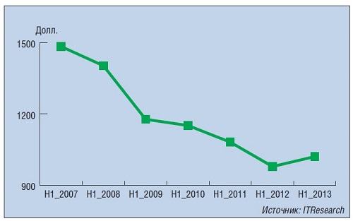 До недавнего времени средневзвешенная стоимость проекторов устойчиво шла вниз (см. рисунок). В текущем году средневзвешенная стоимость показала даже некоторое увеличение. Не так давно она опустилась ниже уровня 1000 долл., а затем от него “отскочила”. Позже, вероятно, она все же снизится, но не исключено, что возможно зарождение и обратного тренда.