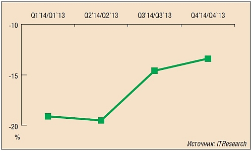 Однако, несмотря на итоговое падение, некоторое оживление на рынке ПК все же было зафиксировано. Оно относится ко второй половине года. Если в начале года темпы падения сегмента находились на уровне -19% (как и по итогам 2013 г.), то в третьем-четвертом кварталах уже явно получше – «всего» -14%. (cм рис.)