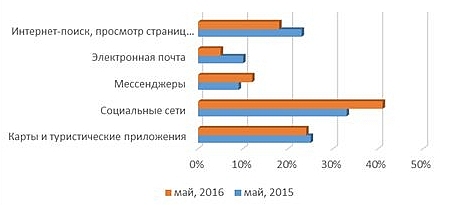 Среди путешествующих по России туристов выросла популярность и традиционных услуг связи, таких как звонки и SMS, которые в поездках переживают «второе рождение»: темп роста их потребления на порядок выше, чем в среднем по стране. По итогам отчетного периода, объем исходящих вызовов в поездках вырос в 1,9 раза за год на фоне одноцифровой среднероссийской динамики, что свидетельствует о том, что россияне перестали бояться звонить в роуминге и активно рассказывают близким о впечатлениях от поездок. Причем они делятся эмоциями не только в разговорах, но и отправляя SMS, популярность которых выросла за год сразу на 40% в сравнении с 7%-ным ростом весной 2015 г.
