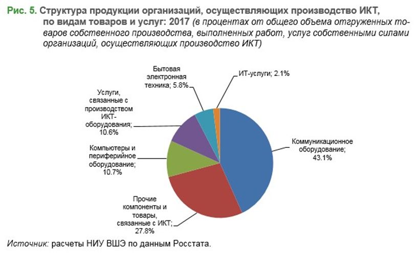 На долю коммуникационного оборудования в 2017 г. в России приходилось 43,1% отгруженной ИКТ-продукции собственного производства. Компоненты и части ИКТ-товаров, такие как интегральные схемы, диоды и транзисторы, печатные платы и другие элементы, составили 27,8%. Около 10,7% пришлось на компьютеры и периферийное оборудование, еще 10,6% — на услуги, связанные с производством ИКТ-оборудования, 5,8% — на бытовую электронную технику, и 2,1% — на ИТ-услуги.