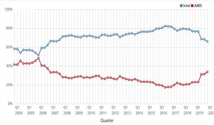 Динамика соотношения долей ПК с процессорами AMD и Intel