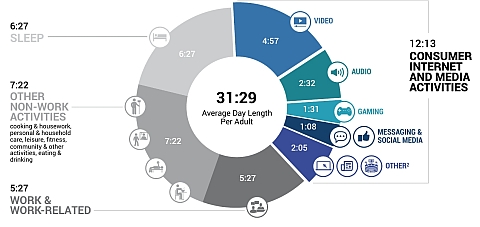 В условиях экономики внимания основным ресурсом становится время, которое потребитель затрачивает, оставаясь на том или ином онлайновом ресурсе. Казалось бы, время — ресурс объективно ограниченный. Не тут-то было: как показывает исследование Technology and Media Outlook 2020, проведённое компанией Activate Consulting, типичные сутки среднего взрослого американца продолжаются сегодня 31 час с лишним ( см диаграмму), 12 из которых как раз отводится на потребление цифрового контента, прежде всего медийного: 4 ч 57 мин — на видео, 2 ч 32 мин — на аудио, 1 ч 31 мин — на видеоигры и т. д.