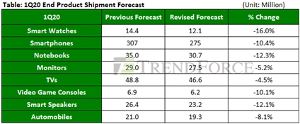 ◦ Ноутбуки, мониторы, телевизоры. Если оставить в стороне фотоэлементы, устройства по конструкции довольно простые, то именно цепочки поставок ноутбуков, компьютерных мониторов и ЖК-телевизоров в наибольшей степени оказались задеты вспышкой COVID-19. Количество компонентов для каждой единицы такой продукции весьма велико, и нарушение цепочки поставок для каждого из них вносит дополнительный вклад в задержку со сборкой устройства в целом. Эксперты TrendForce скорректировали свой предыдущий прогноз по мировым поставкам ЖК ТВ в I кв. 2020 г. с 48,8 млн единиц до 46,6 млн, компьютерных мониторов — с 29,0 млн до 27,5 млн. Для ноутбуков снижение ещё более ощутимо: с 35,0 млн до 30,7 млн. Вдобавок все перечисленные устройства недёшевы, что в свете снижения покупательной способности населения Китая и всего мира также оказывает на темпы грядущего восстановления этих рыночных сегментов негативное влияние.
