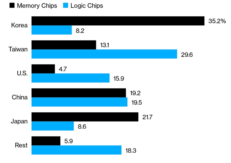 На данный момент Южная Корея доминирует в мировом производстве микросхем памяти с долей 35,2%, однако в глобальном выпуске логических микрочипов (разного рода контроллеров и процессоров) на неё приходится пока лишь 8,2%. При этом более 18% приходится на Прочие регионы, за счет которых можно увеличить свою долю.