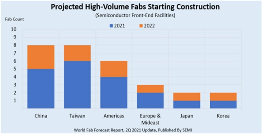 Глобальная ассоциация производителей полупроводниковой индустрии (SEMI) сообщает в своём июньском отчёте, что к концу текущего года общее число возводимых в разных странах мира новых микропроцессорных фабрик достигнет 19, а в 2022г. будет начато строительство ещё по меньшей мере 10. Невзирая на прикладываемые США усилия по стимуляции роста собственной полупроводниковой индустрии, основная масса новых фабрик в ближайшие два года будет закладываться в материковом Китае и Тайване.