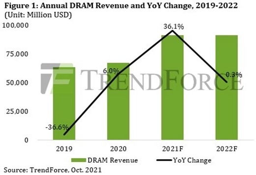 По итогам 2021 г. аналитики предсказывают общую выручку поставщиков DRAM на уровне 90 млрд долл. США и считают, что в 2022-м она сохранится примерно такой же (см. рисунок), поскольку вследствие упомянутого ранее перепроизводства средняя цена реализуемой на оптовом рынке микросхемы оперативной памяти сократится за будущий год как раз на те самые 15-20%, на которые, как ожидается, вырастет общий спрос ИТ-индустрии на DRAM.