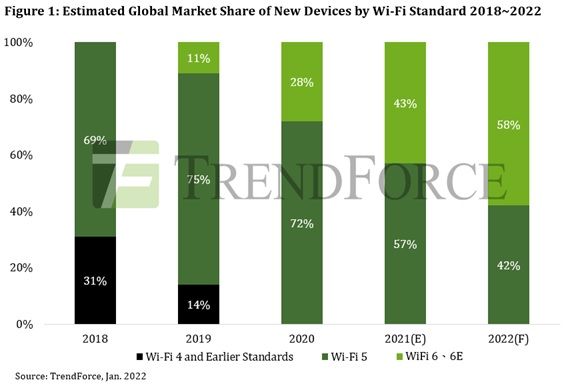 По оценке TrendForce, в 2021 г. доля новых устройств в адаптерами Wi-Fi 6/6e на мировом рынке достигла 43%, почти сравнявшись с аналогичным показателем для гаджетов с Wi-Fi 5 (57%). При этом адаптеры более ранних стандартов практически сошли на нет в поставляемом на рынок оборудовании ещё в 2020 г. ( см. рисунок)