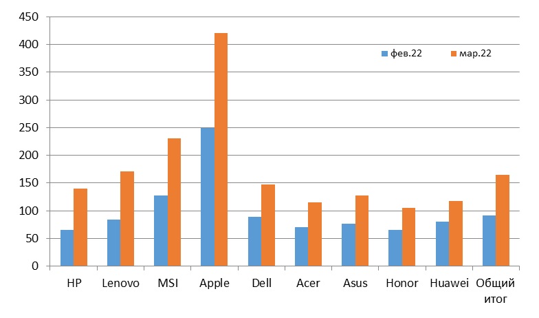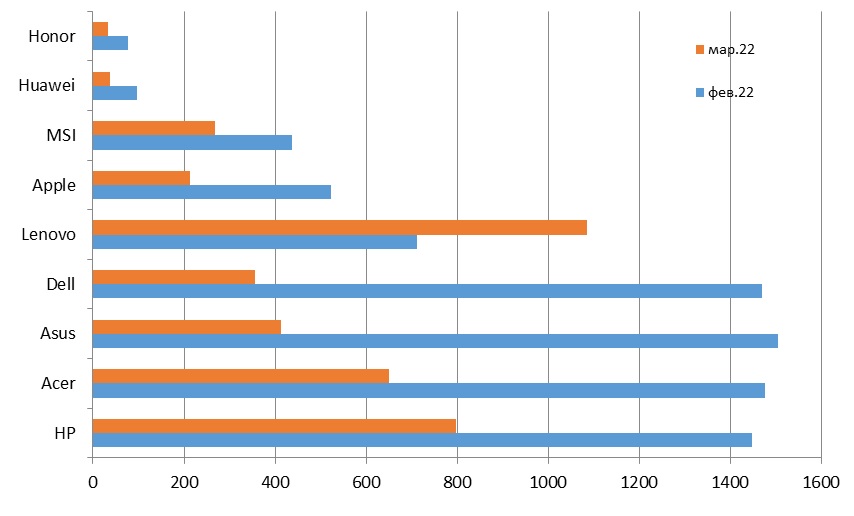 Рис. 2. Количество предложений моделей ноутбуков по вендорам в феврале и марте 2022 г., штук.