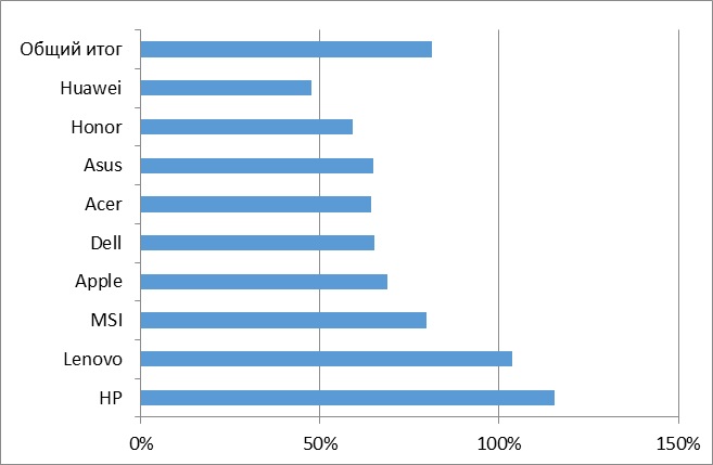 Как сообщают крупнейшие розничные сети, ценник на электробытовую технику в целом подрос на 50%. Но, по нижеприведенным данным, ноутбуки — самый горячий товар компьютерного сегмента — подорожали в среднем на целых 80%.