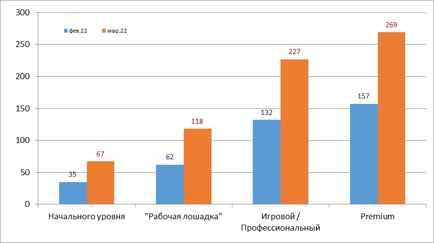 Рис. 4. Средняя рублевая цена на ноутбуки по некоторым категориям в феврале и марте 2022 г., тыс. руб.