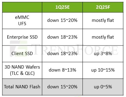 Оценка и прогноз динамики цен на модули NAND по категориям в I и II кв. 2025 г., % квартал к кварталу