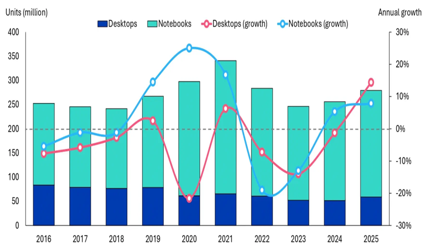 Глобальные отгрузки декстопов (тёмные фрагменты) и ноутбуков (светлые) по годам, млн единиц, столбцы, и их динамика (красный цвет — для настольных ПК, синий — для мобильных), линии, %, правая источник: