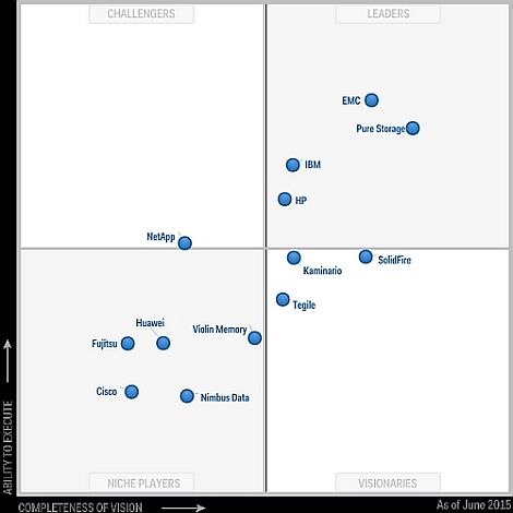 Аналитическое агентство Gartner в конце июня опубликовала магический квадрант поставщиков твердотельных массивов. При составлении квардранта Gartnet не учитывал модели СХД, которые как опция могут поставляться в полностью твердотельной конфигурации, рассматривались только массивы, спроектированные исключительно под твердотельные накопители.