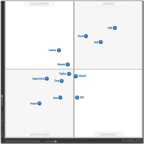 В разряд «претендентов» перешел и другой китайский вендор — Huawei. Но перешел из сегмента «нишевых игроков», т.е. с повышением. Это произошло благодаря существенным инвестициям компании в инновации и сильным позициям на рынке телекоммуникационного оборудования. Еще два вендора из нишевых игроков превратились в «визионеров». Hitachi обладает большой технологической экспертизой в СХД, что помогает этому вендору применять в своих блейд-серверах решения, улучшающие доступность и эффективность использования ресурсов, а также расширяет свой канал продаж за пределами японского рынка. Компания SGI традиционно имеет сильные позиции на рынке суперкомпьютеров, она успешно продвигает свои блейд-серверы как платформу для SAP HANA и других приложений in-memory. Кроме того, по OEM-соглашению серверы SGI продвигает HPE, что улучшает их известность на рынке.