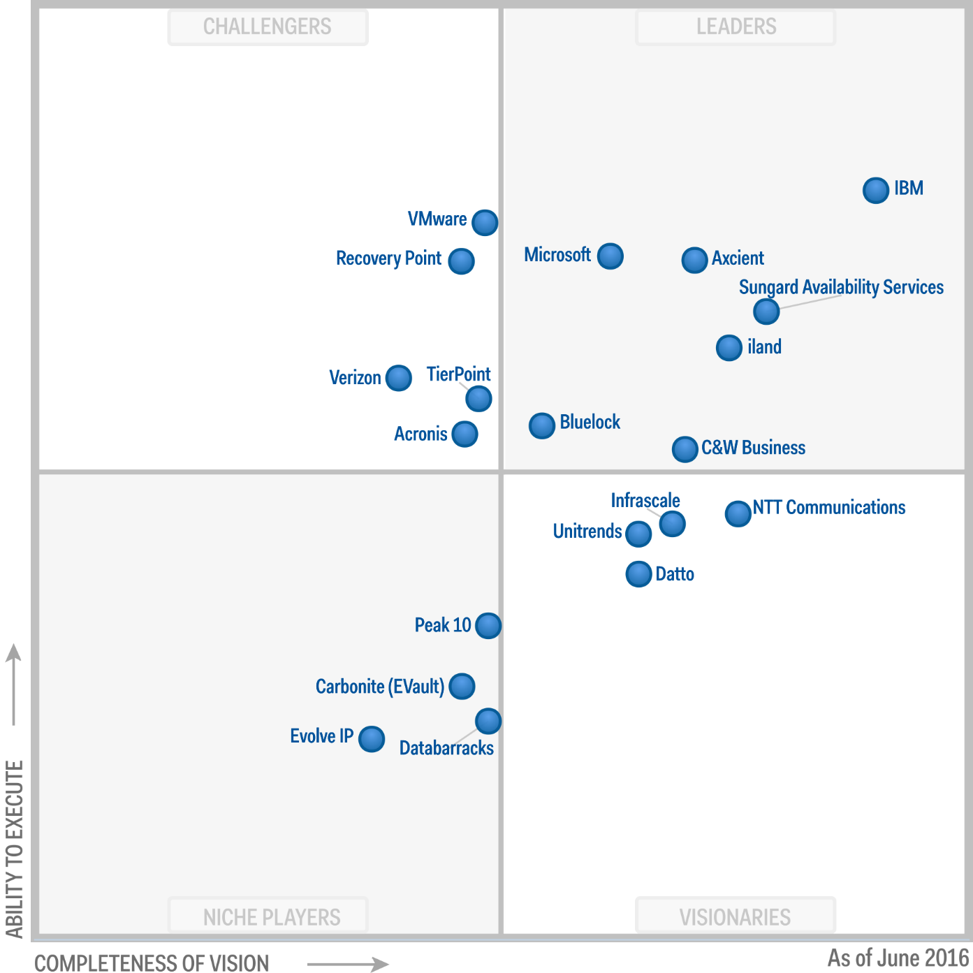 Из представленных на российском рынке провайдеров DRaaS в магический квадрант Gartner попали IBM и Microsoft (лидеры), Acronis и VMware (претенденты).
