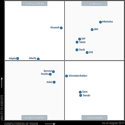 Среди поставщиков, попавших в группу лидеров, Gartner назвало IBM, Informatica, Oracle и SAP (см. рисунок).