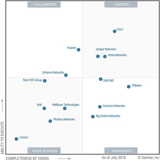 Аналитическое агентство Gartner в июле опубликовало рейтинг производителей коммутаторов для сетей дата-центров Magic Quadrant for Data Center Networking. Традиционно к этой категории сетевого оборудования относятся аппаратные и/или программные решения, обеспечивающие соединения внутри корпоративных дата-центров (прежде всего подключение к их сети серверов), включая коммутаторы класса ядра сети/spine, коммутаторы уровня доступа (Top of Rack [ToR], leaf), виртуальные коммутаторы, фабрики Ethernet, операционные системы, Network Operating System (NOS), а также средства управления, автоматизации и координации работы этих компонентов сетевой инфраструктуры («оркестровки»).