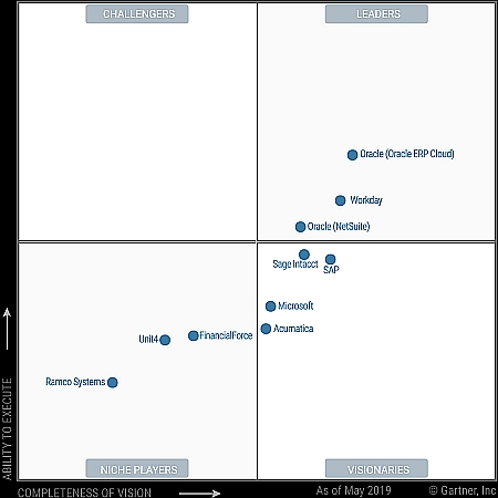 В квадрант лидеров попали сразу два решения корпорации Oracle: Oracle ERP Cloud и Oracle NetSuite. Первое решение обладает мощными средствами управления финансами и сильными позициями на глобальных рынках благодаря поддержке разных национальных языков, валют и местного законодательства, однако у него часто очень сложное внедрение и в некоторых странах не хватает квалифицированных кадров для выполнения проектов по внедрению Oracle ERP Cloud.