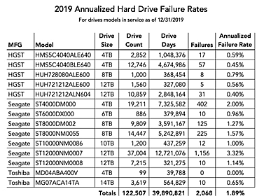 В очередном отчёте, суммирующем данные за 2019 г., представлены статистически обоснованные частоты отказов на протяжении года непрерывной эксплуатации (annualized failure rates, AFR) для почти 125 тыс. жёстких дисков, находившихся в эксплуатации в серверных стойках компании на протяжении всего прошедшего года.