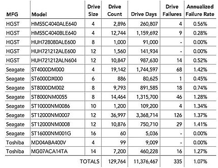 В таблице представлены статистически обоснованные частоты отказов на протяжении года непрерывной эксплуатации (annualized failure rates, AFR) для 15 моделей накопителей различных производителей: 5 под брендом HGST, 8 Seagate и 2 Toshiba.