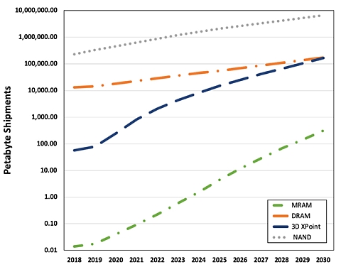 DRAM, наиболее распространённый сегодня тип оперативной памяти, продолжит пользоваться спросом — однако с динамикой куда менее впечатляющей, чем у более передовых технологий. Речь идёт прежде всего о памяти 3D XPoint (основанной на физическом принципе фазового перехода; более дешёвой, чем DRAM, и притом более скоростной, чем NAND), поставки которой в 2030 г. принесут её изготовителям, по мнению аналитиков, не менее 25 млрд долл. На другие перспективные технологии, MRAM (магниторезистивная память, использующая спиновые вентили) и STT-RAM (разновидность MRAM с переносом спинового момента), в 2030-м в сумме придётся около 10 млрд. долл.