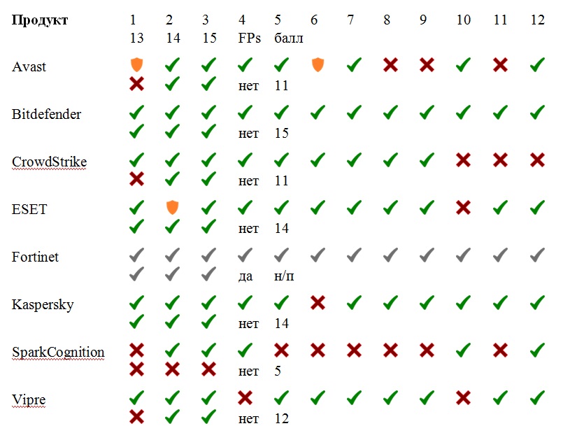 В исследовании участвовали следующие продукты: Avast Business Antivirus Plus, Bitdefender Gravity Zone Elite Security, CrowdStrike Falcon Pro, ESET PROTECT Entry, Fortinet FortiClient (включая FortiSandbox и FortiEDR), Kaspersky Endpoint Security for Business Select, SparkCognition DeepArmor Endpoint Protection Platform и Vipre Endpoint Security Cloud.