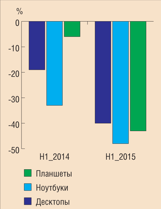 Сегодня в глубоко отрицательной зоне находятся все подсегменты российского компьютерного рынка, но ноутбуки по-прежнему падают сильнее других (рис. 1).