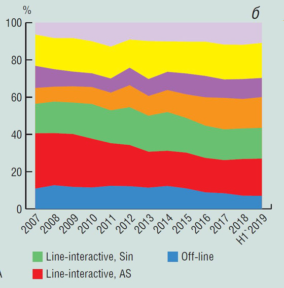 Сокращение ценовой разницы вкупе с более продвинутой функциональностью и приводит к тому, что устройства on-line потихоньку вытесняют из ниши критичных решений интерактивные ИБП с чистой синусоидой (SIN). В натуральном выражении сегмент легкий on-line приближается к line-interactive по объемам продаж в штуках, а в деньгах уже наступил паритет ( рис. 5). Очевидно, что тренд к увеличению доли легкого on-line будет продолжаться, и через несколько лет интерактивные устройства начнут быстро сдавать, особенно когда их основной производитель, компания APC by Schneider Electric, окончательно сместит приоритеты в пользу on-line.