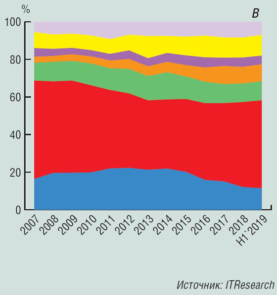 Очевидно, что резервные и интерактивные (AS) устройства абсолютно доминируют в натуральном выражении (рис. 4а), но при этом их доля с 2007 г. планомерно снижалась с 92,3% до 85,6% рынка. А учитывая, что остаток – это в основном более дорогое инфраструктурное оборудование, чей вклад почти удвоился, понятен и тренд к увеличению средневзвешенной стоимости, о чем упоминалось выше.