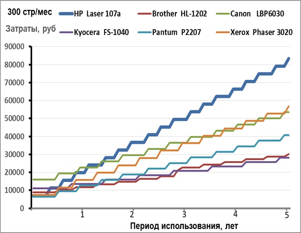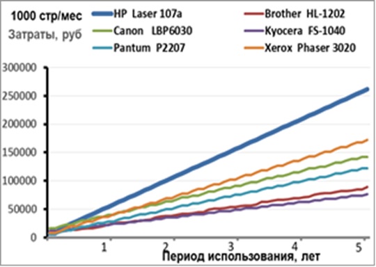 При более интенсивной печати (регулярную печать объемом 1000 страниц в месяц для принтеров этого класса можно считать предельно допустимой) разница в затратах на печать между моделями становится еще более ощутимой.