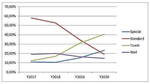 На долю сегмента Standard еще недавно приходилось около 60% рынка (в деньгах 30%), но сейчас этот показатель резко снизился по сравнению с уровнями прошлого года. По итогам 2020 г. на него приходилось уже менее 20% отгрузок, а в деньгах и того меньше – около 6,5%.