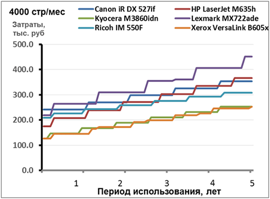 Итоговые затраты определяются как сумма цены устройства и всех расходных материалов, использованных в течение заданного периода времени для печати определенного среднемесячного количества страниц.