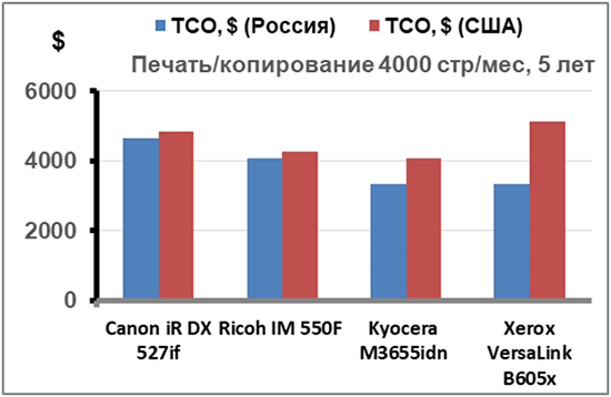 Рис. 4. Общие затраты (ТСО) моделей МФУ в России и США, интенсивность печати/копирования 4 тыс. страниц в месяц в течение 5 лет