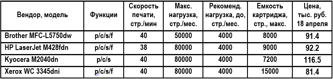 Все отобранные устройства представляют собой полнофункциональные МФУ для небольших офисов или рабочих групп с интенсивной печатью. Модели поддерживают факсимильную связь (кроме Kyocera M2040dn) и работу в сети, имеют достаточно высокие для своего класса ресурсные характеристики. Основные параметры этих моделей приведены в таблице 1.