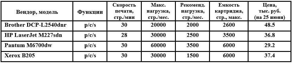 Для оценки показателей затрат при использовании оригинальных и совместимых картриджей были выбраны четыре популярных модели настольных монохромных МФУ производительностью до 30 стр./мин, ориентированных на использование в малом или домашнем офисе - Brother DCP-L2540dnr, HP LaserJet M227sdn, Pantum M6700dw и Xerox B205 (основные их характеристики приведены в табл. 1).