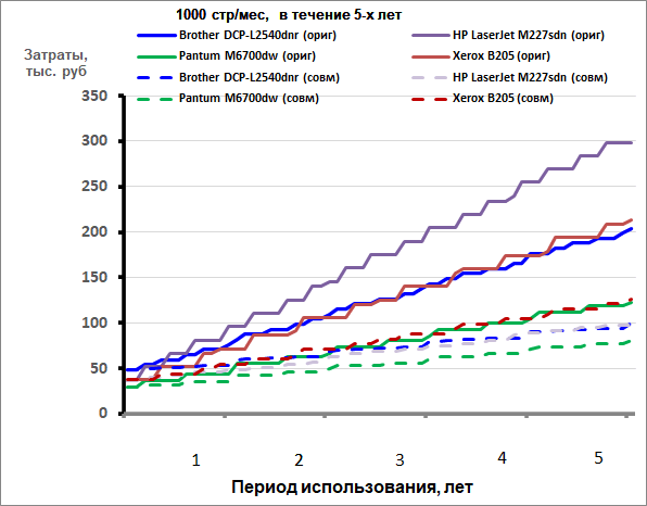 Итоговые затраты определяются как сумма цены устройства и всех расходных материалов, использованных в течение заданного периода времени для печати определенного среднемесячного количества страниц.