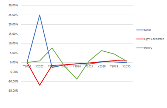 Даже на макроуровне необходимо считать УБ ИБП разных классов по отдельности. Напоминаем, что ITResearch использует ряд классификаций, в зависимости от конкретных нужд. В данном случае вполне можно использовать разделение всех ИБП на три класса: Массовые (Mass), Легкие корпоративные (Light Corporate) и Тяжёлые (Heavy).
