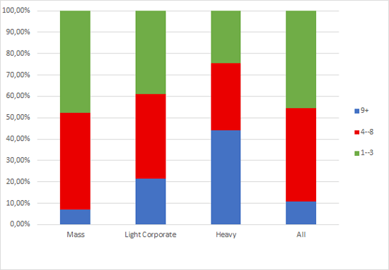 Следует отметить, что наблюдаемое снижение установленной базы произошло в первую очередь за счет массового сегмента (завязанного на ПК). Корпоративный сегмент при этом фактически остался «при своих», даже немного подрос (см. рис. 4). Здесь было бы еще полезно проанализировать более тонкие тенденции, связанные с замещением интерактивных устройств от APC легкими онлайновиками от других производителей. Также в тяжелом сегменте есть тренд к росту средней мощности. Но это всё деликатные и чувствительные элементы анализа, выходящие за рамки публичного обзора.