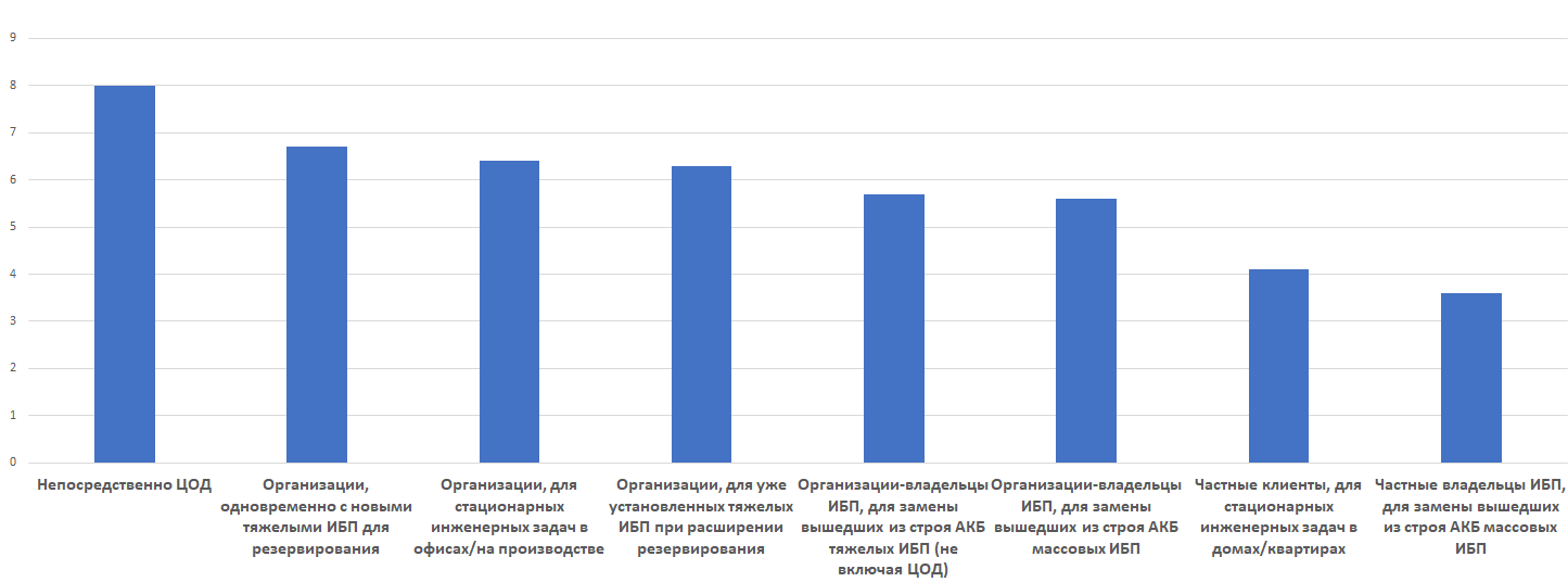 Очевидно, что рассмотрев технологии и характеристики АКБ, далее мы должны в первую очередь задаться вопросом: кто же самые важные потребители АКБ? Мы попросили экспертов оценить важность различных групп потребителей по 10-балльной шкале (чем больше важность, тем выше оценка).