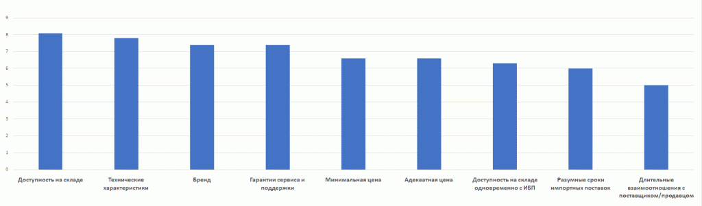 Примечательно, что из предложенных нами критериев эксперты не отвергли ни один, и разница по важности между ними не драматична. Но все же «доступность на складе» явно выделяется в качестве первостепенного фактора. Очевидно, что для заказчиков очень болезненно ждать еще и батареи, поэтому предпочитают брать из наличия.