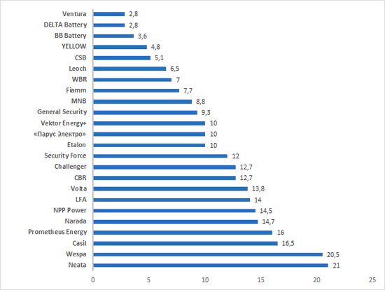 Итак, наименьшая оценка (а значит, наиболее высокое место) – у брендов DELTA Battery и Ventura. Справедливости ради следует отметить, что свою оценку по DELTA Battery дали все без исключения опрошенные эксперты, а отметить Ventura сочли необходимым только половина. Так что здесь вполне могла быть и флуктуация. Статистики маловато.