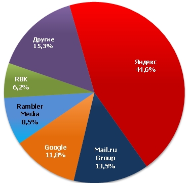 Яндекс прочно удерживает первую позицию: в 2010 г. доля компании составила 44,6% от всего объема рынка, причем основную долю доходов поисковик получает в контекстном секторе. Mail.ru по-прежнему получает практически все свои доходы в сегменте медийной рекламы, общая доля компании на рынке составила 13,5%. Google Russia занимает третью позицию с 11,8% рынка, весь этот объем приходится на контекстный сектор. Rambler и РБК замыкают пятерку лидеров рынка.