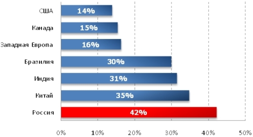Согласно исследованиям J’son & Partners Consulting, в интернет-среде наибольший темп роста интернет-рекламы в 2010 г. показал рынок России (около 42% по сравнению с 2009 г.). Темпы роста рынка интернет-рекламы в Китае в 2010 г. составили 35%. Хорошие темпы роста — на уровне 30% — показывают также Индия и Бразилия. А вот насыщенные рынки развитых стран Западной Европы, Канады и США показали по итогам 2010 г. более скромные результаты. Наиболее низкие темпы роста рынка интернет рекламы в 2010 г., из рассмотренных в исследовании стран, оказались у США — всего 14%.