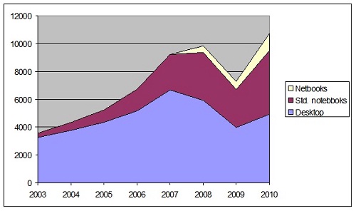 В целом рынок компьютеров на 9% превысил уровень 2008 г. Единственным сегментом, который не вышел на предкризисные показатели, стали настольные ПК. И, учитывая относительно низкие показатели роста этого сектора, нет стопроцентной уверенности, что когда-либо он к ним вообще вернется.