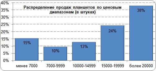 Помимо диагональной структуры определенный интерес должно вызывать и распределение рынка по ценовым диапазонам (см. рисунок). Пока что по итогам 2011 г. самые значительные продажи приходились на диапазон свыше 20 тыс. руб., и всем понятно, чья продукция там была в основном представлена. Но налицо и значительные объемы реализации планшетов в два и даже три раза более дешевых. Такие разрывы в ценах благотворно влияют на расширение рынка, поскольку способствуют охвату новых целевых групп покупателей, особенно региональных. Очевидно, что рынок будет прирастать в первую очередь за счет «дешевого» и «сверхдешевого хвоста». Но и дорогая продукция будет продаваться неплохо, тем более что благодаря относительно короткому циклу жизни продукта здесь уже существует значительный вторичный рынок: оборудование на замену выбывающих устройств.